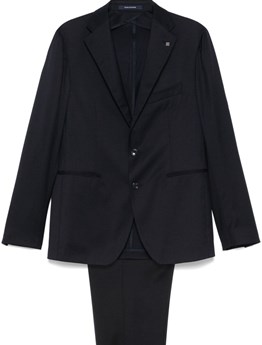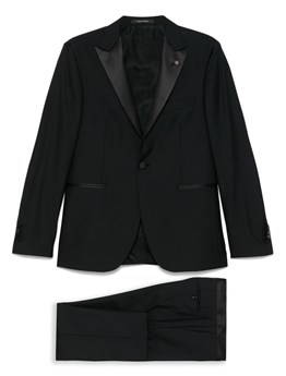 Black single-breasted jacket with classic lapels, front button closure, and all-over tone-on-tone logo detail. Flap pockets. Trousers with front closure, side and back welt pockets. Slim fit. product code: GK036TFR203S8051